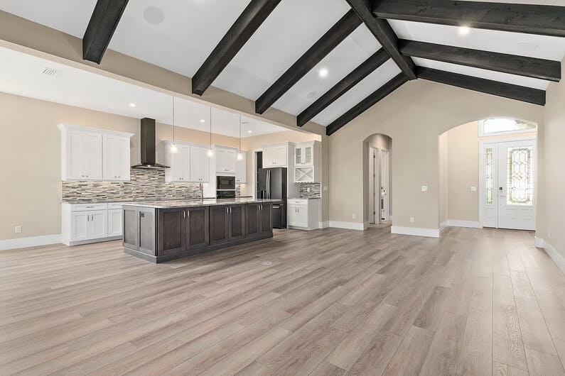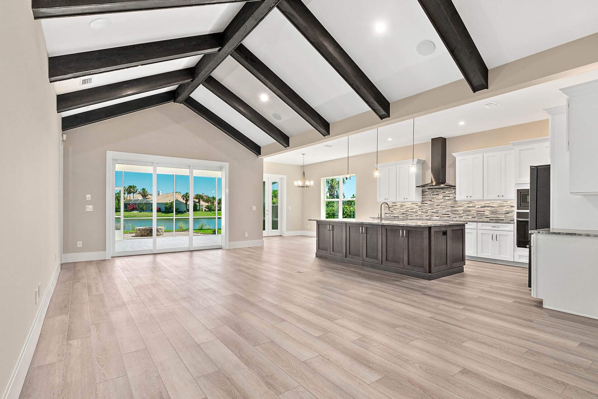 The open living area of the Casa Bella is ideal for entertaining. The large kitchen has a center island and a walk-in pantry. These rooms all showcase a vaulted ceiling with an opportunity to include beams.