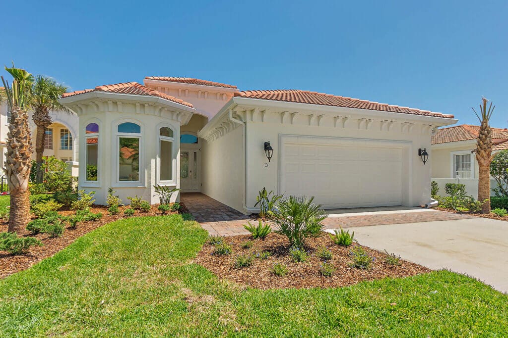 This Mediterranean design is ideal for a narrow lot. An arched entry welcomes guests into the home. Inside, a foyer leads guests into the main living area – a large, open great room, dining room and kitchen combination.